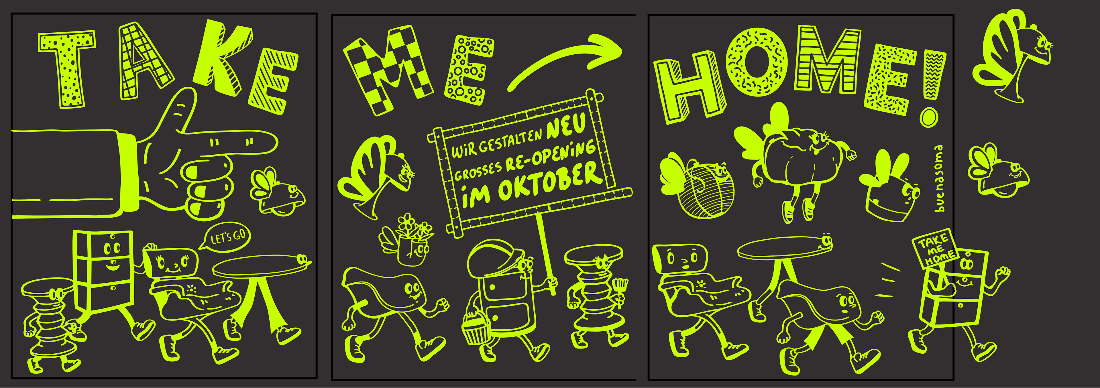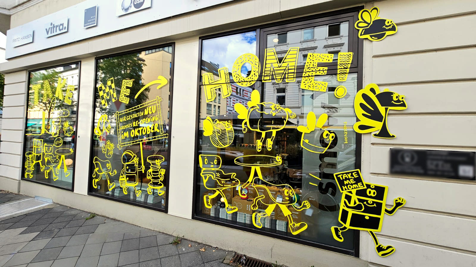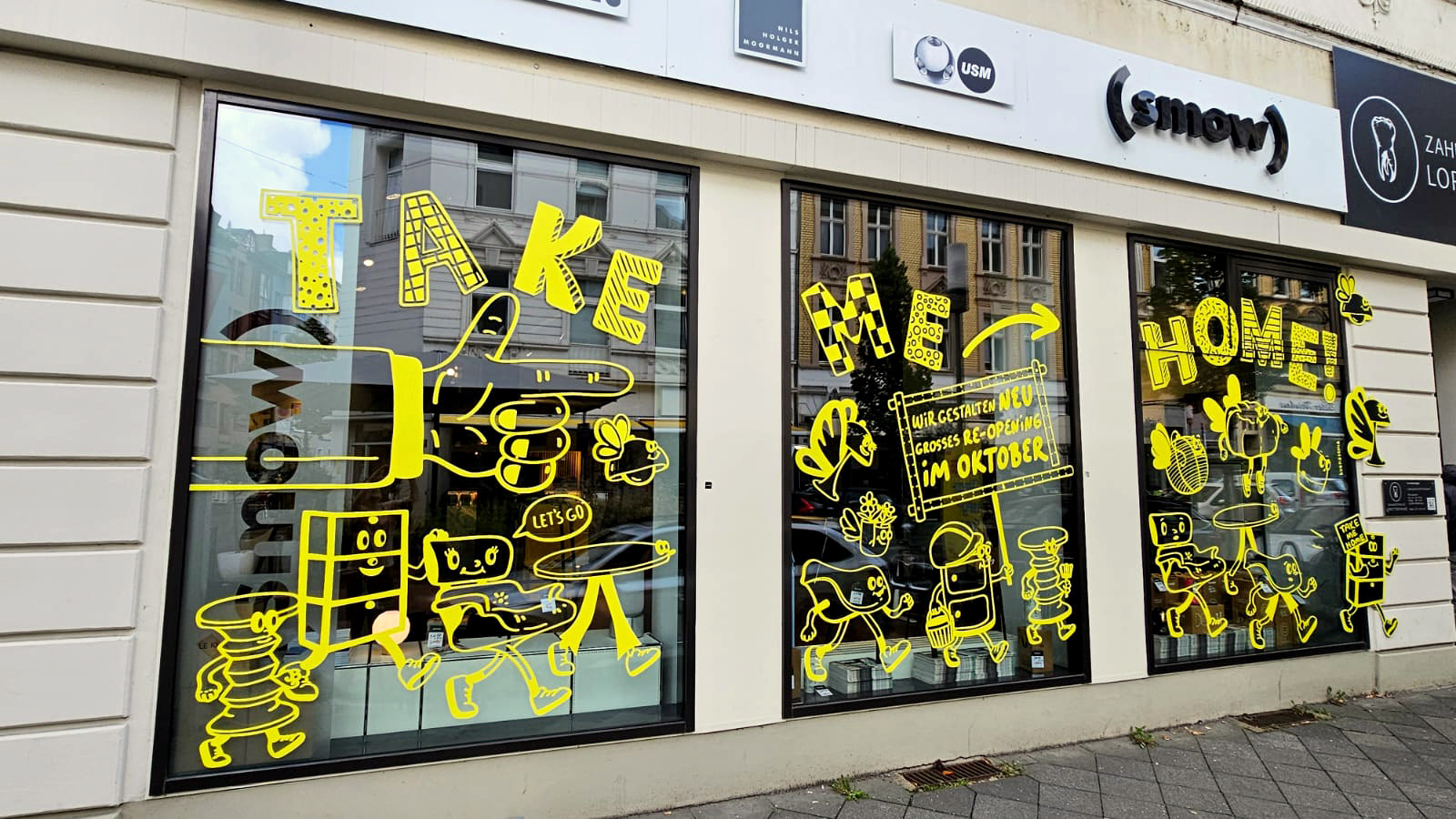Illustration von den Schaufensteraufkleber für den Möbelgeschäft "(smow)" in Düsseldorf.